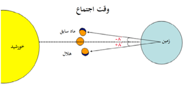 هنگاميکه ماه به حرکت خود ادامه ميدهد، قبل از آنکه از حالت اجتماع، ۸ درجه (تقريباً ۱۴ ساعت) بگذرد، يعنی، هنگاميکه فاصله زاويه بين دو نيم خطی که دنيا را به ماه و دنيا را به خورشيد وصل می کند کمتر از ۸ درجه (کمتر از ۱۴ ساعت) باشد، هلال در هيچ زمان و مکانی قابل رؤيت نخواهد بود. هنگاميکه حداکثر ۱۸ درجه شود، ماه از محاق رها شده، در هنگام غروب خورشید، در ظرف مدت ۴۵ دقيقه، در طرف غرب، در بالای خط افق، هلال ماه نو ديده ميشود. اما، از سبب ۵۷ دقيقه پارالاکس يعنی اختلاف منظر اش هنگاميکه به افق، ۵ درجه نزديک شود، نمی تواند ديده شود. در وقت رها شدنش از محاق، در هر مملکتی که خورشيد در حال غروب باشد، در مملکت هايی که در همان طول قرار داشته باشند، هلال ديده می شود. در ساعات بعدی و شب های بعدی، در مملکت هايی که در غرب اينها قرار دارند نيز بعد از غروب خورشيد می تواند دیده شود.