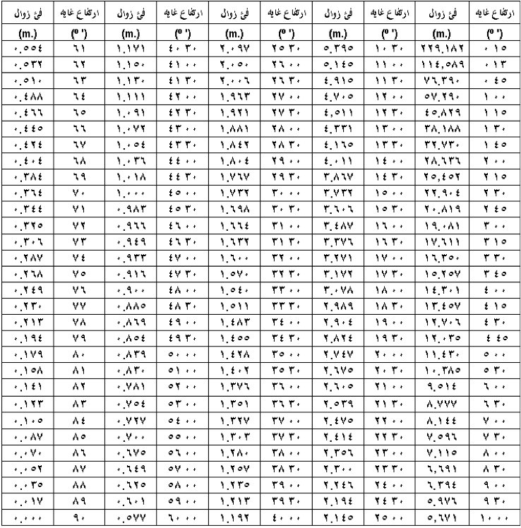 برای هر درجه عرض، جدول ارتفاعات نماز عصر